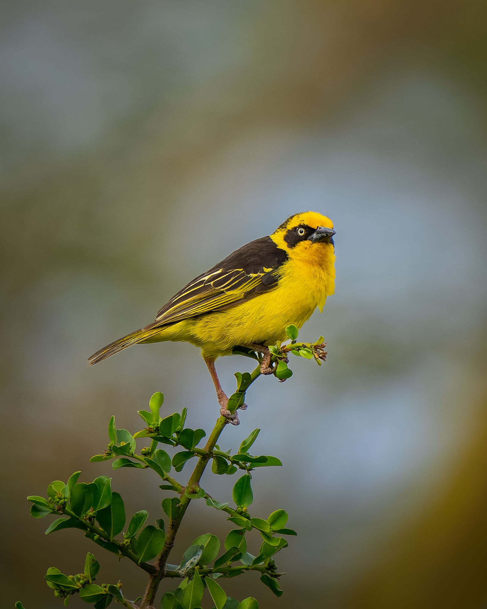 After spotting a pattern in this Yellow Bishop's behavior, I set up and waited. My patience was rewarded with this intimate portrait, showcasing the vibrant yellow plumage against the soft backdrop of its natural habitat.