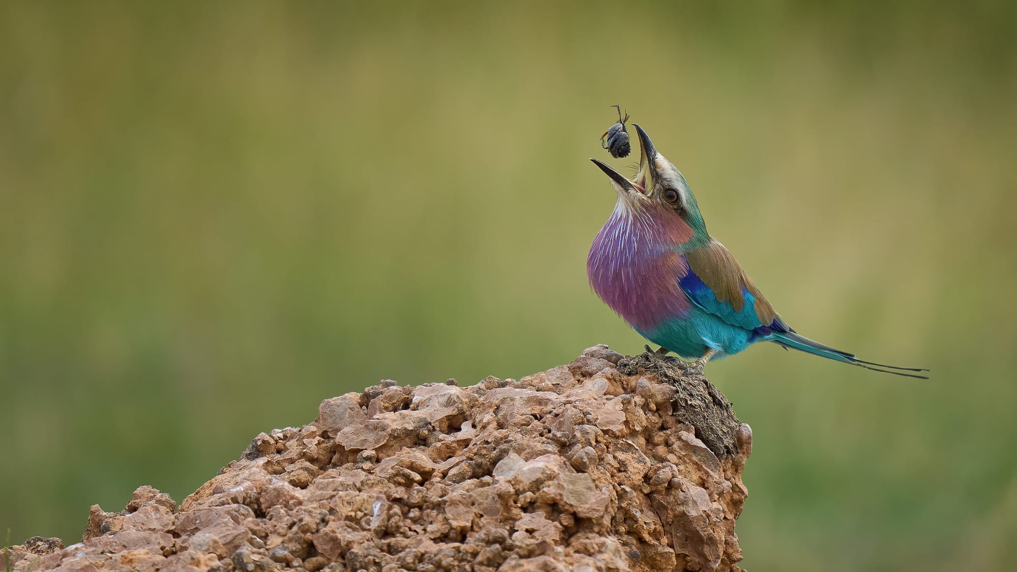 A splash of turquoise and lilac against Kenya's savanna—this lilac-breasted roller's feeding behavior captured through patience and perfect timing in Amboseli National Park reveals nature's small but magnificent moments.