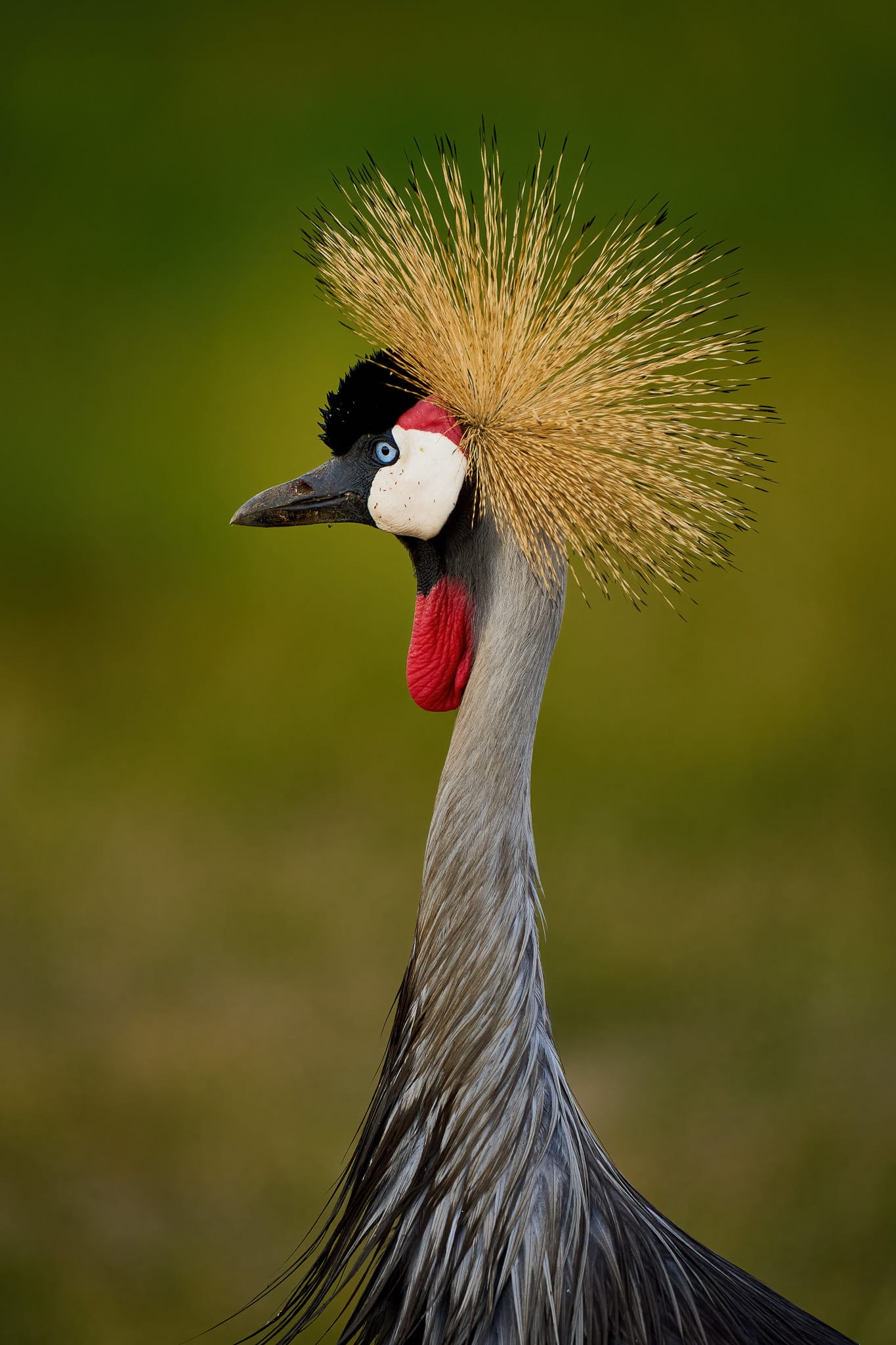 Face to face with Uganda's national bird in Kenya's Amboseli Park. This crowned crane portrait captures the golden crown and striking features that make these birds East African icons.