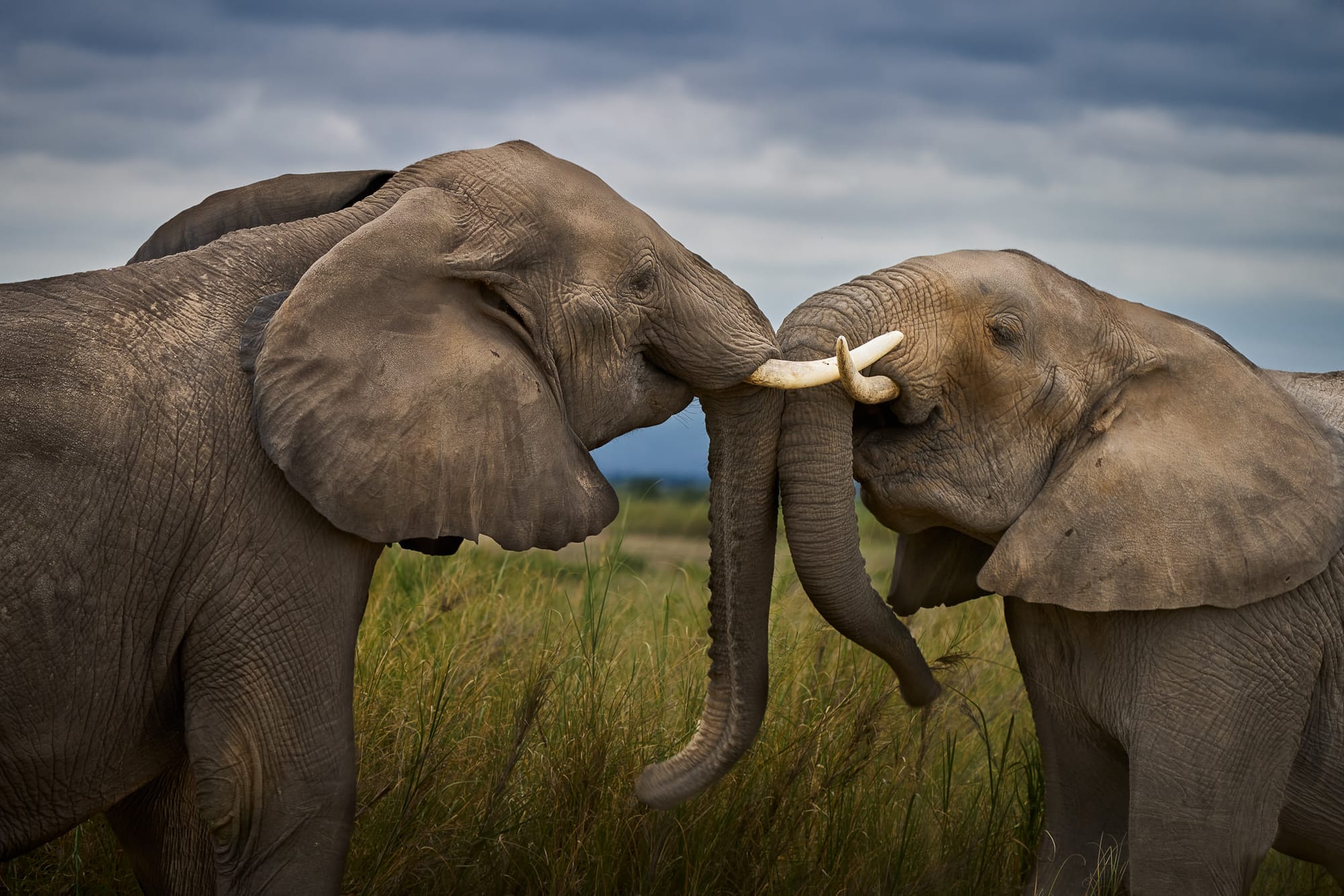 In Amboseli's golden grasslands, two young elephants engage in ritualistic play beneath threatening skies. This intimate moment reveals how elephant society develops through playful interaction regardless of nature's dramatic backdrop.