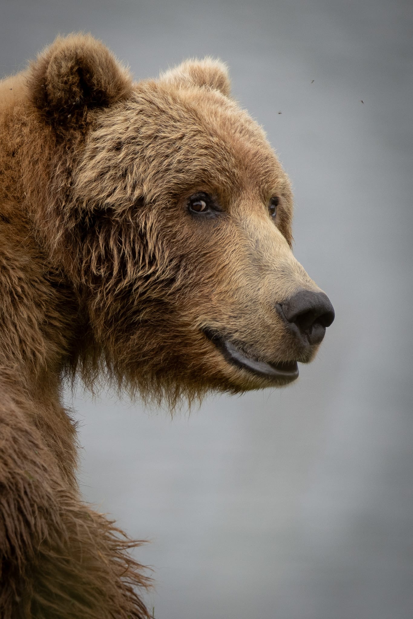 A mother Kodiak bear's thoughtful gaze captured during a wilderness encounter on remote Kodiak Island. The massive predator, spotted with her cubs, revealed both power and gentleness in Alaska's pristine wilderness.